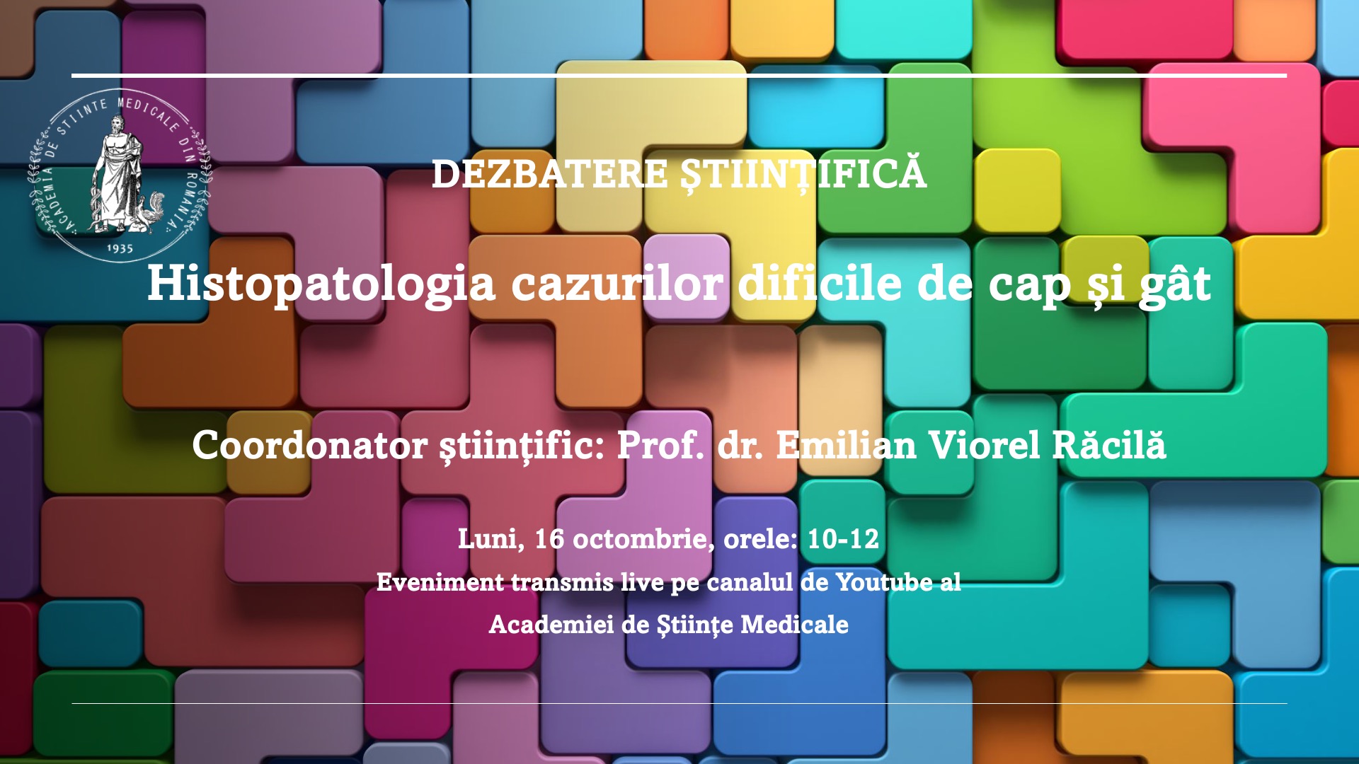 Academia de Științe Medicale organizează dezbaterea științifică cu tema “Histopatologia cazurilor dificile de cap și gât”. Evenimentul va avea loc în data de 16 octombrie, începând cu ora 10 și va fi transmis live pe canalul de Youtube al Academiei de Științe Medicale. Coordonatorul științific al dezbaterii este Prof. Dr. Emilian Viorel Răcilă. Participanți: Prof. […]