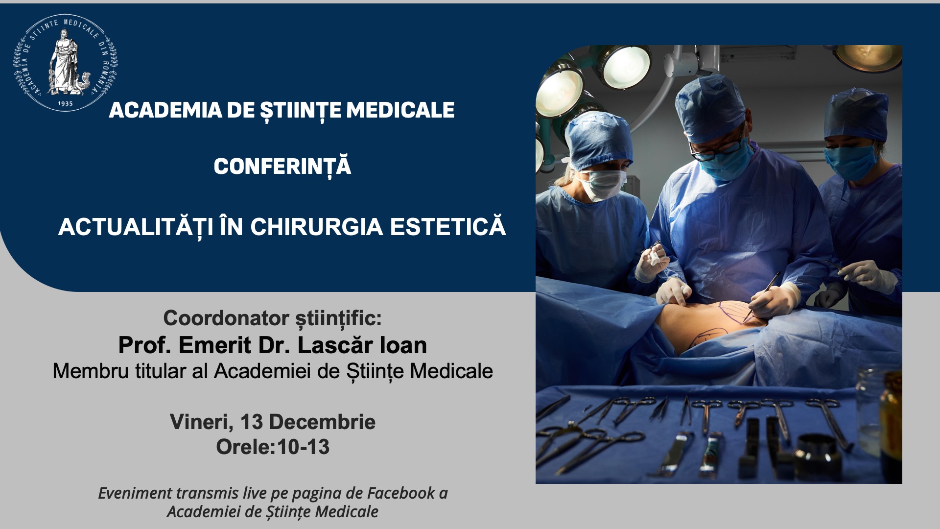 Academia de Științe Medicale organizează conferința cu tema “ Actualități în chirurgia estetică ” Coordonatorul științific al dezbaterii este Prof. Emerit Dr. Lascăr Ioan, membru titular al Academiei de Științe Medicale. Evenimentul va avea loc în data de 13 decembrie, începând cu ora 10, și va fi transmis live pe pagina de facebook a Academiei de Științe […]