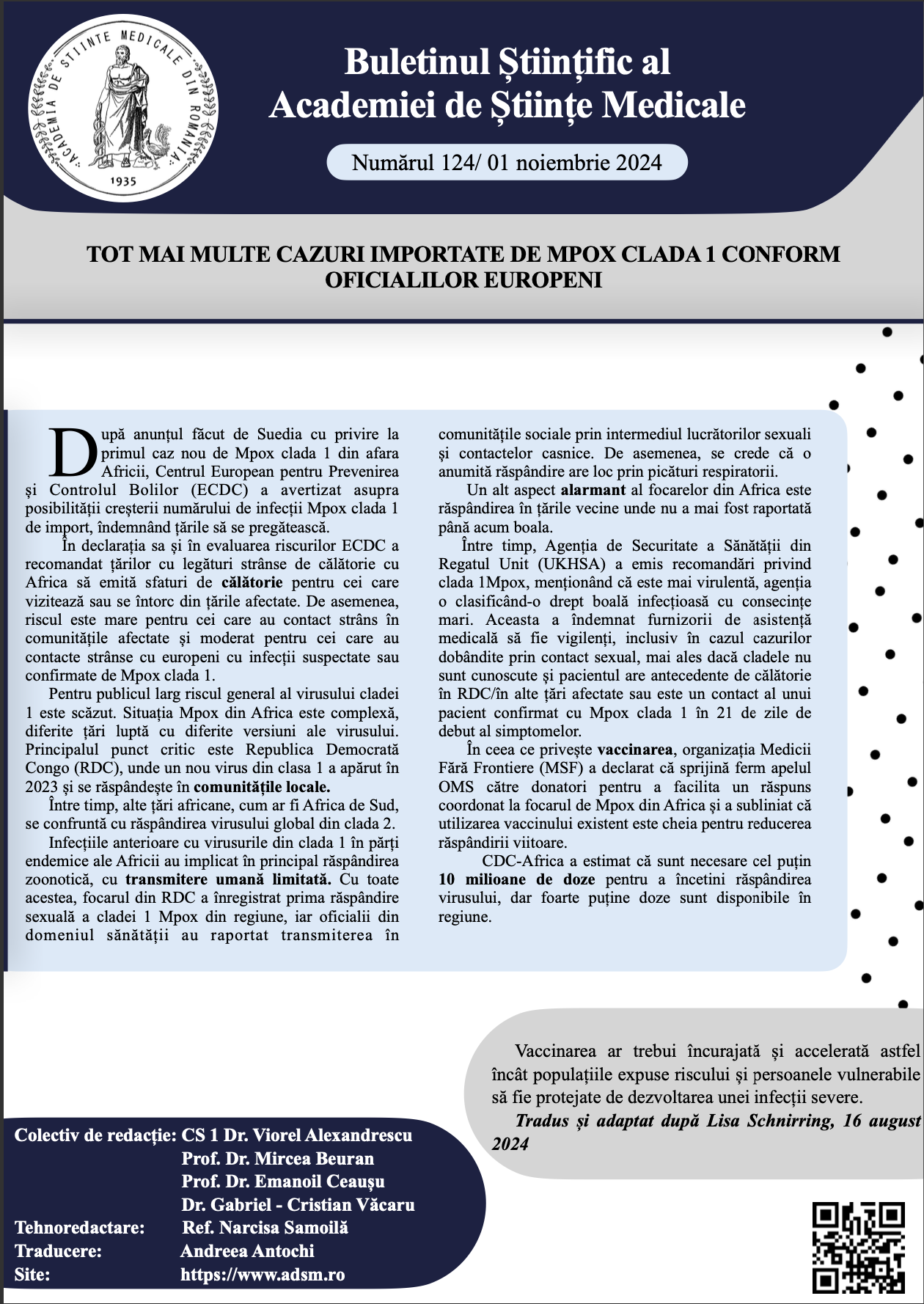 Buletinul Științific al Academiei de Științe Medicale – Nr.124/ 1 noiembrie 2024Posted on noiembrie 1, 2024 Pentru a citi întregul buletin științific, click aici: Buletin stiintific nr. 124