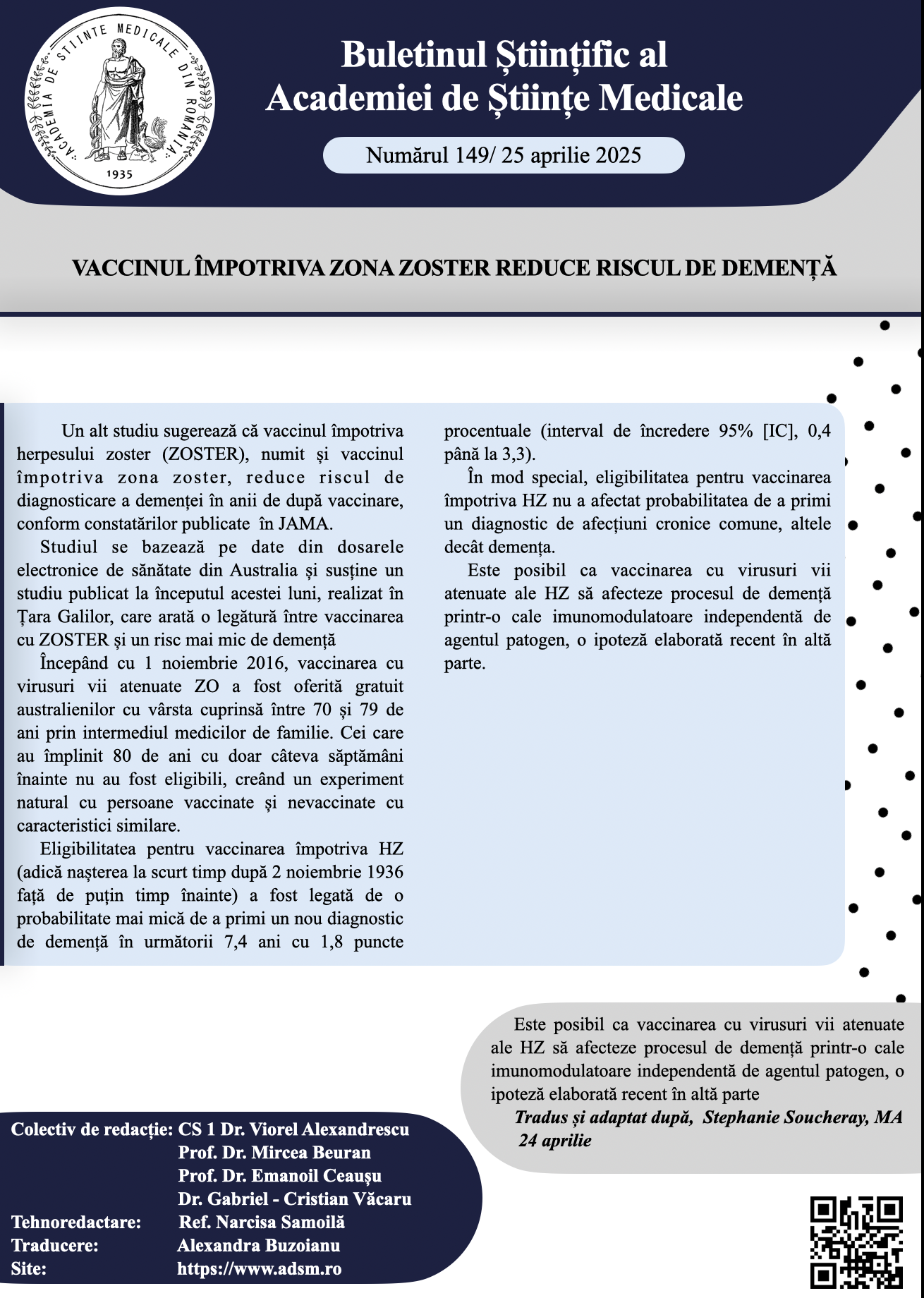 Buletinul Științific al Academiei de Științe Medicale – Nr.149/ 25 aprilie 2025Posted on aprilie 25, 2025 Pentru a citi întregul buletin științific, click aici: Buletin stiintific nr.149