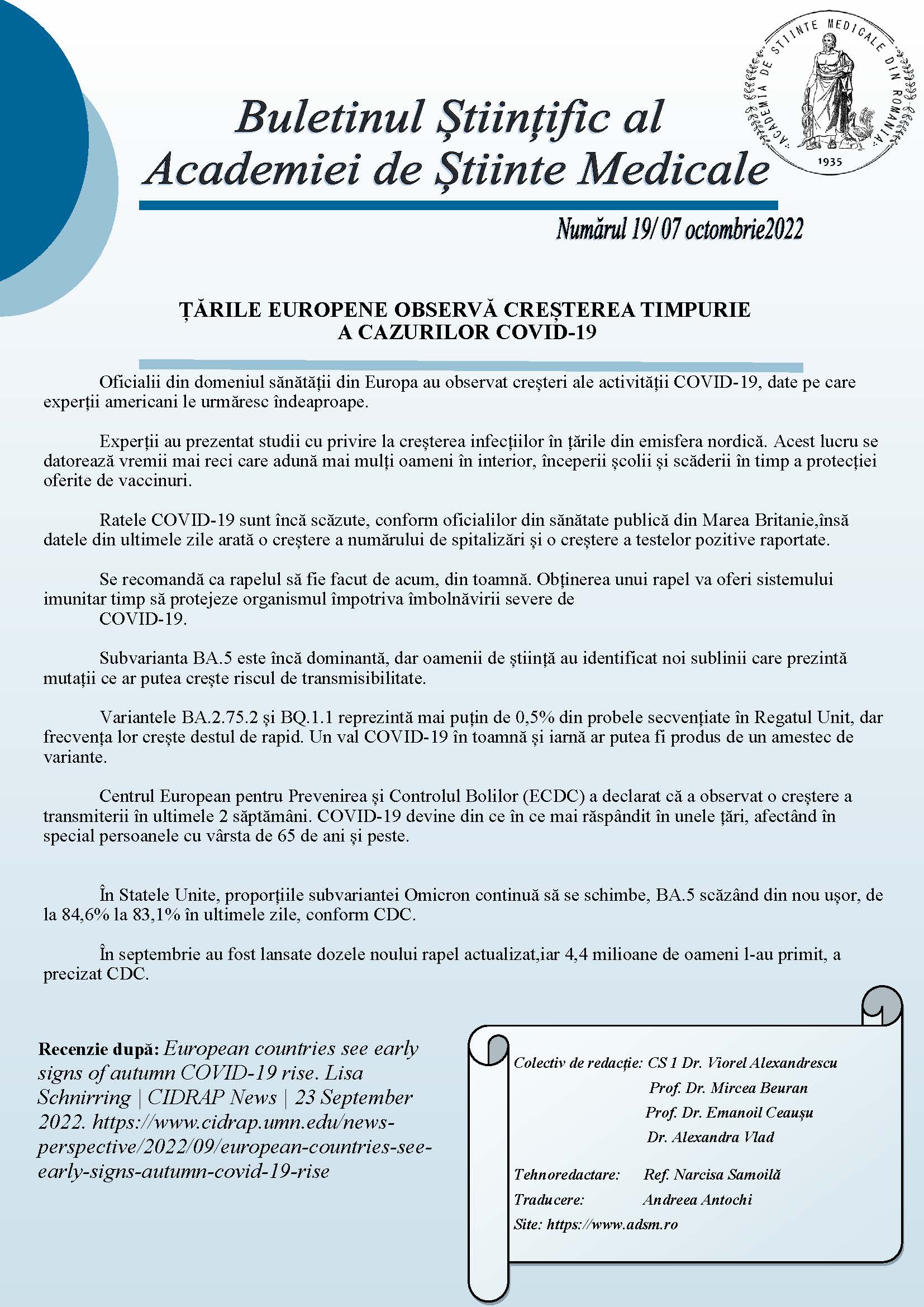 Buletinul Științific al Academiei de Științe Medicale – Nr.19/7 octombrie 2022Posted on octombrie 7, 2022 Pentru a citi întregul buletin științific, click aici: Buletin ASM nr 19 din 07.10.2022