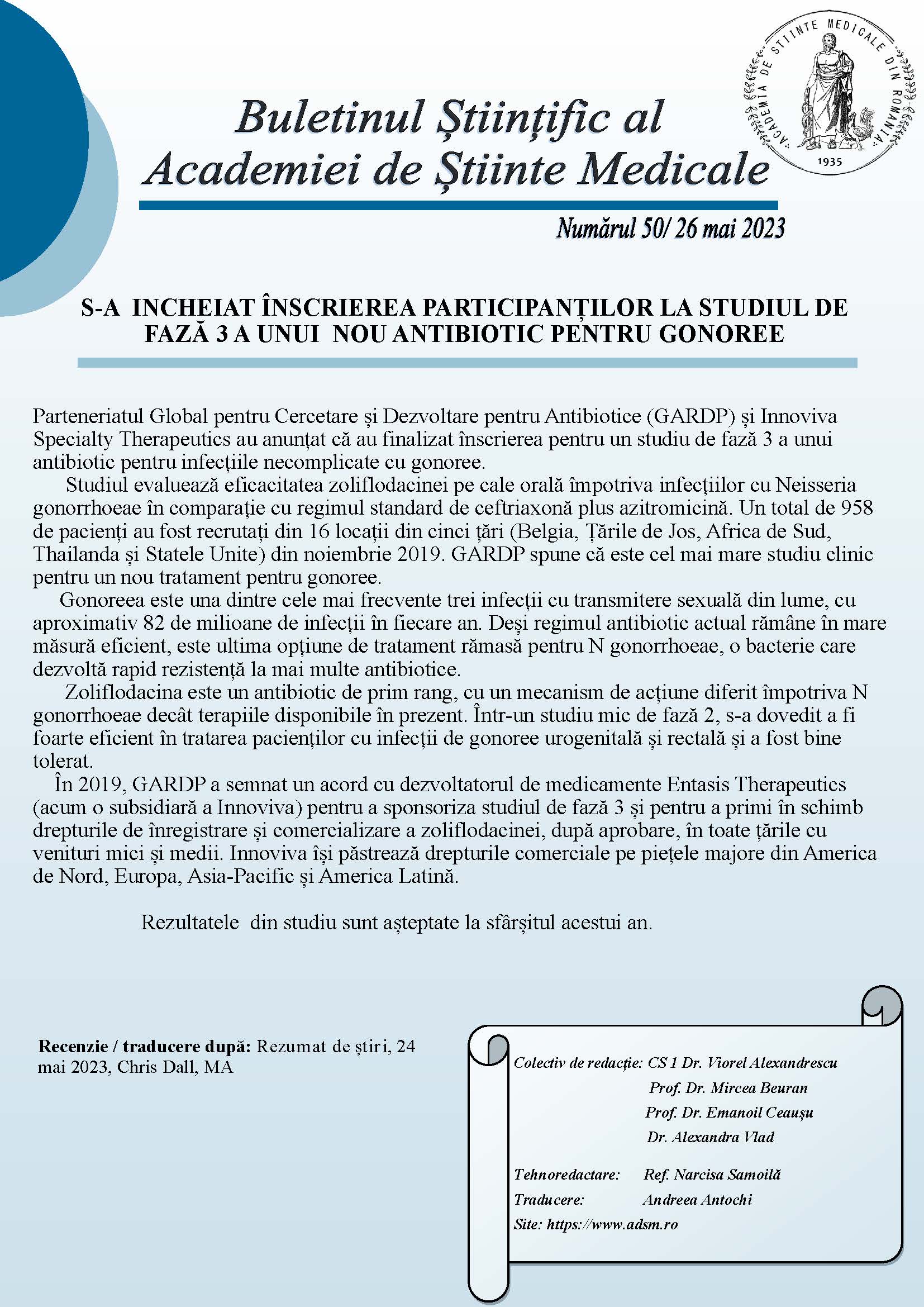 Buletinul Științific al Academiei de Științe Medicale – Nr.50/ 26 mai 2023Posted on mai 26, 2023 Pentru a citi întregul buletin științific, click aici: Buletin ASM nr 50 din 26 mai 2023