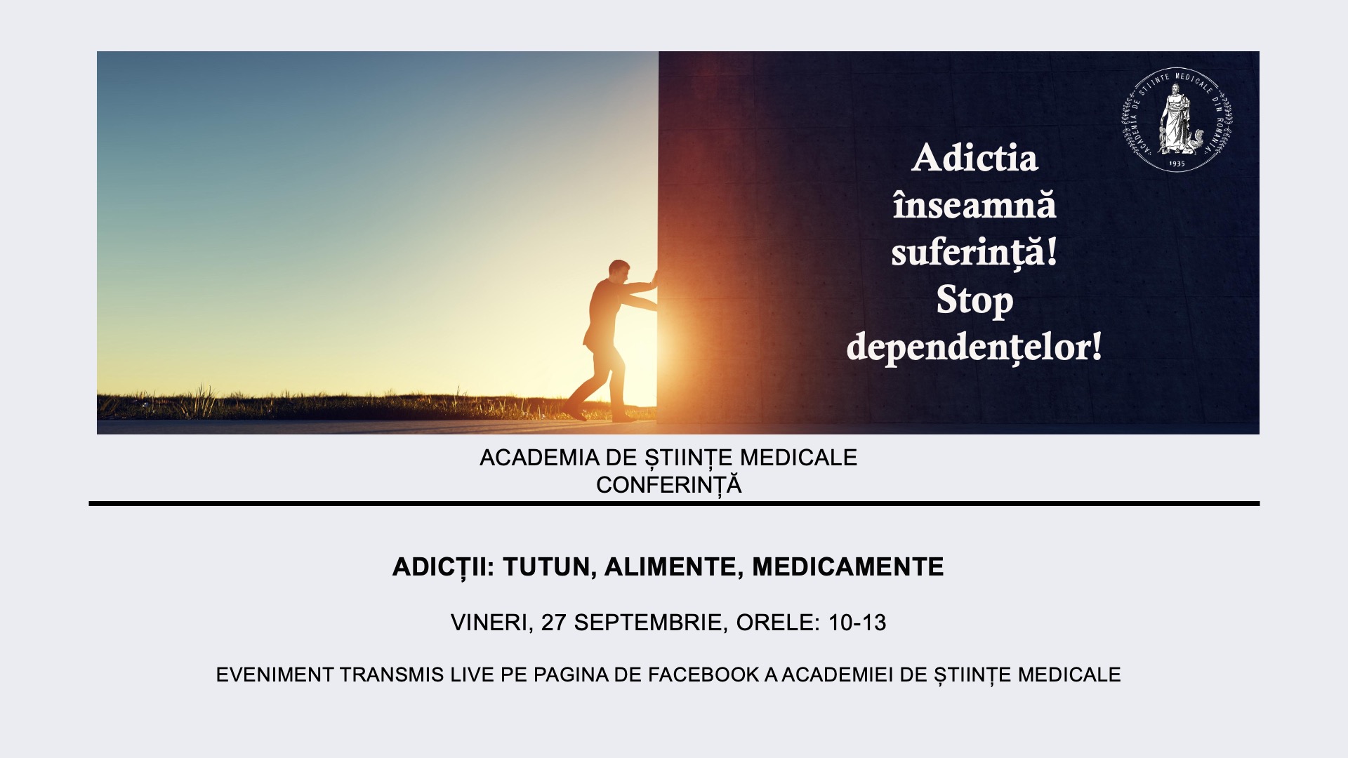 Academia de Științe Medicale organizează conferința cu tema “Adicții: tutun, alimente, medicamente”. Evenimentul va avea loc în data de 27 septembrie, începând cu ora 10, și va fi transmis live pe pagina de facebook a Academiei de Științe Medicale. În cazul în care nu puteți urmări transmisiunea în direct, înregistrarea acesteia va fi disponibilă atât […]