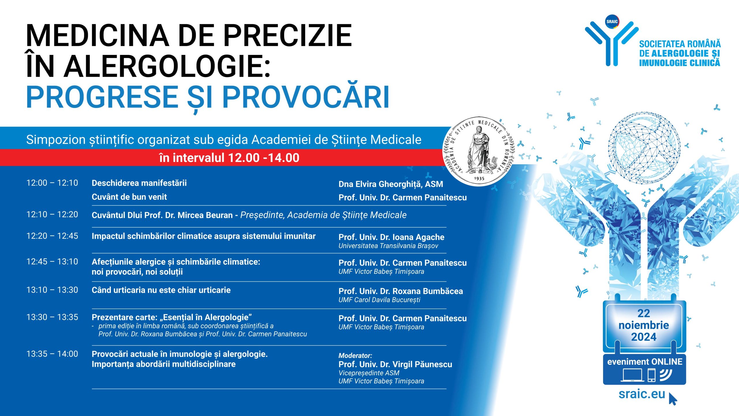 Societatea Română de Alergologie și Imunologie Clinică (SRAIC) organizeză sesiunea științifică Medicina de precizie aplicată în afecțiunile alergice, care va avea loc vineri, 22 noiembrie, orele 12.00-14.00. Evenimentul deschide Școala de iarnă de alergologie 2024, cu titlul Actualități și perspective în diagnosticul și tratamentul afecțiunilor alergice, și este organizat sub egida Academiei de Științe Medicale, o tradiție pentru Societatea Română de Alergologie […]